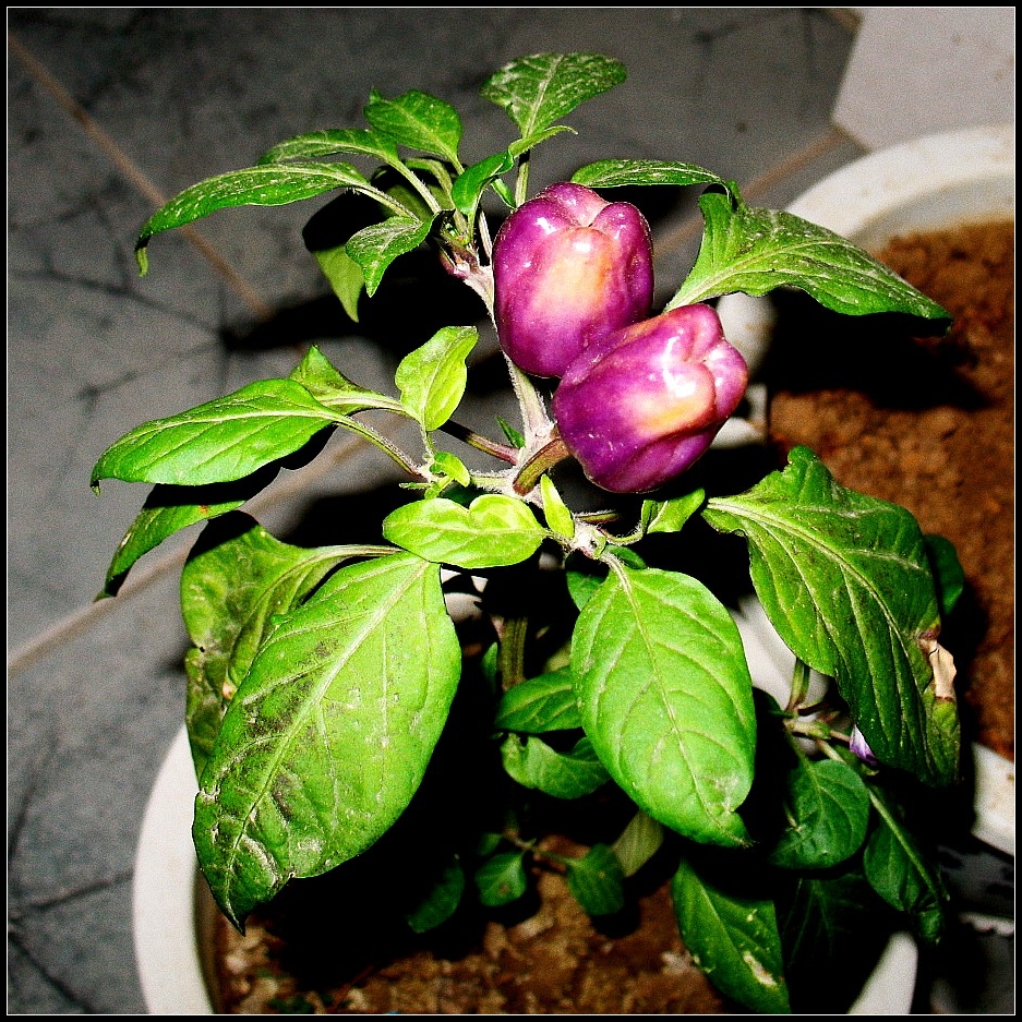 办公室有个老头,从家里带来辣椒籽,说这辣椒籽是杨利伟上天时候带上去的,长成之后结的辣椒是紫色的,然后渐渐变成红色的。办公室好多人要了苗子,我也弄了两棵回家,一棵养到半路死了,另一棵虽然瘦弱,但是活了下来,还结了果。嘿嘿,拍点照片上来给大家看看,颜色已经开始转变了,办公室有人养的长得比较快的已经变成红色的了,那时候特别好看。