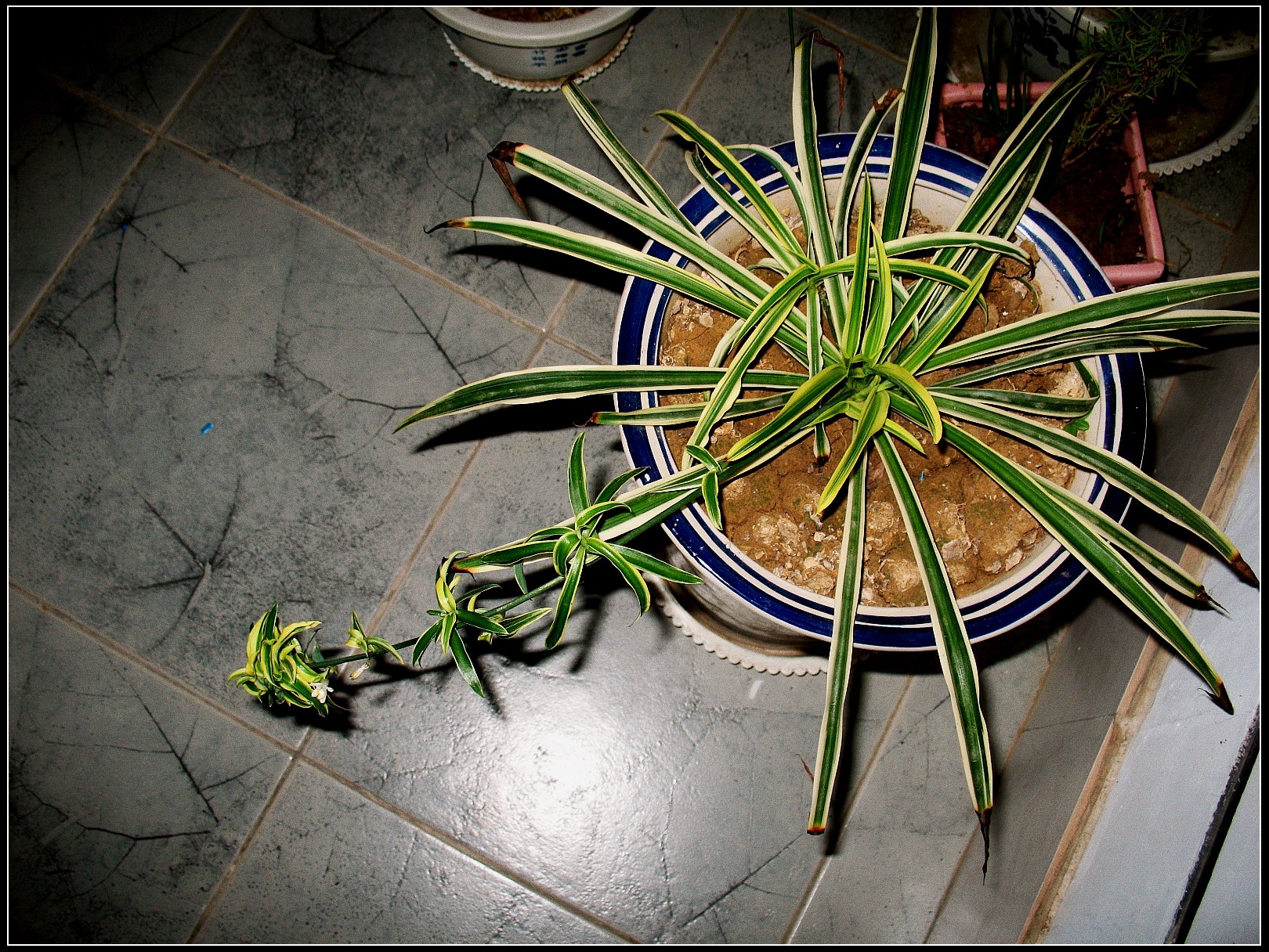 家里养的花当初搬家的时候一大堆,好几种,现在都死掉了,就剩金边兰了,好在这个东西比较好养,不断发岔,最后把所有的花盆都载上金边兰,一晃都养了两年了,到现在才见到开花。晚上吃完饭,胖子在阳台上,突然叫,说看金边兰开花了。我跑出来一看,果然开花了,我说赶快拍下来留个纪念。上照片给大家看看我们养了两年的花。