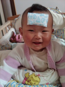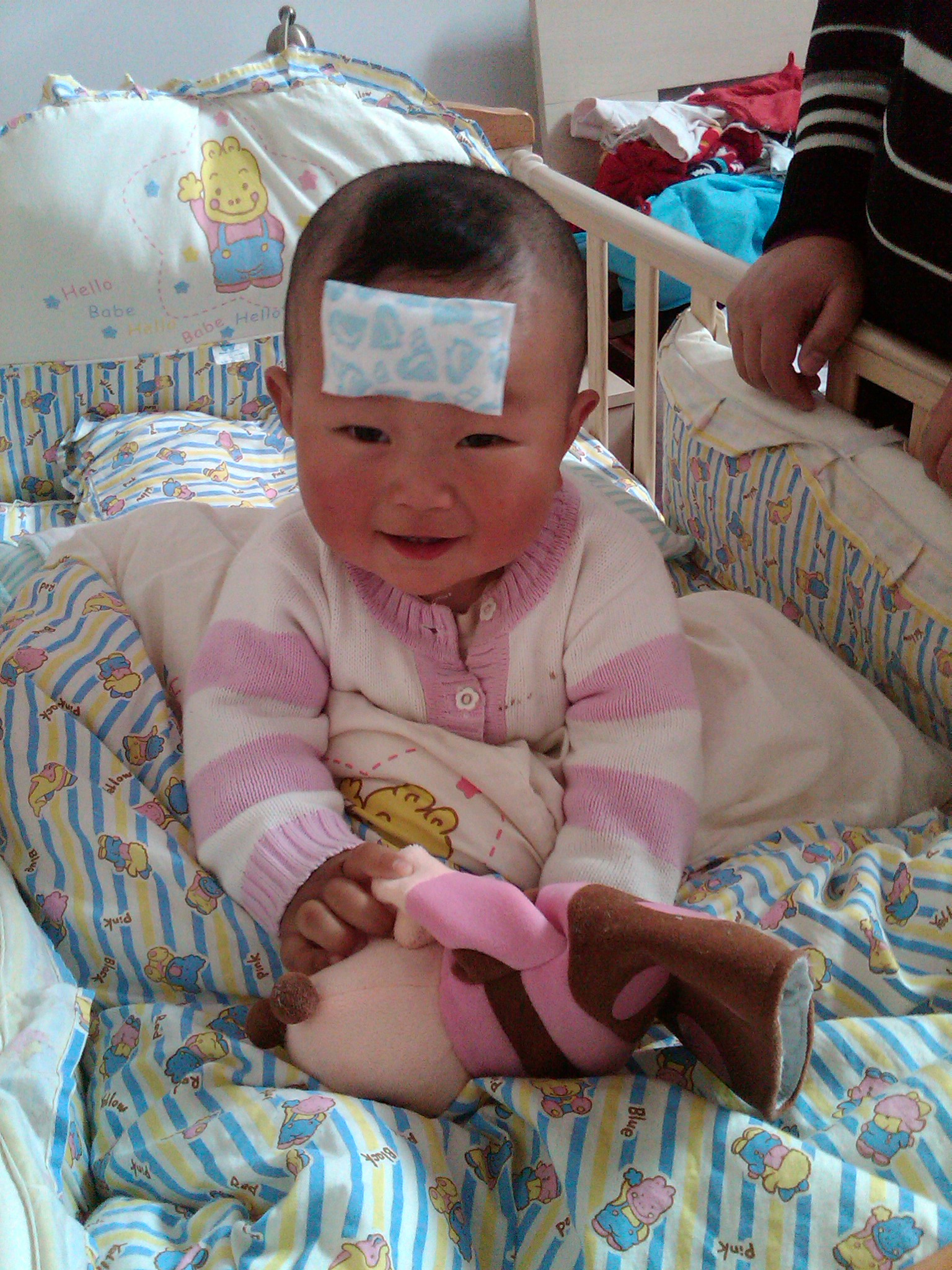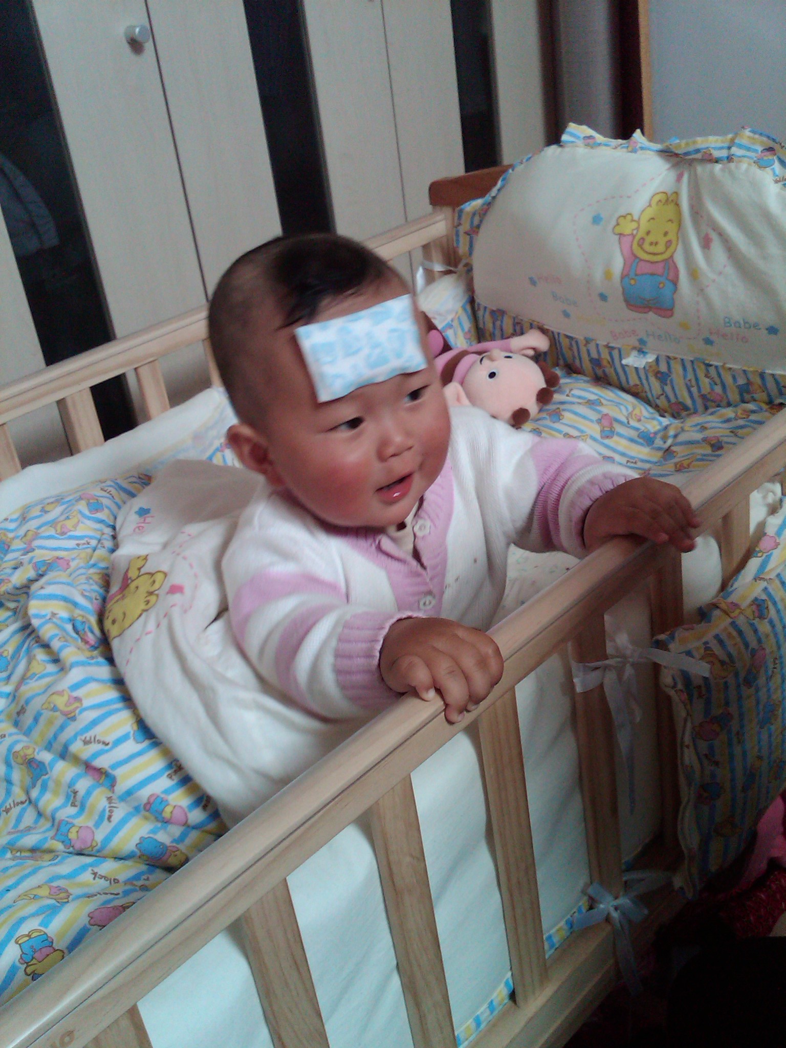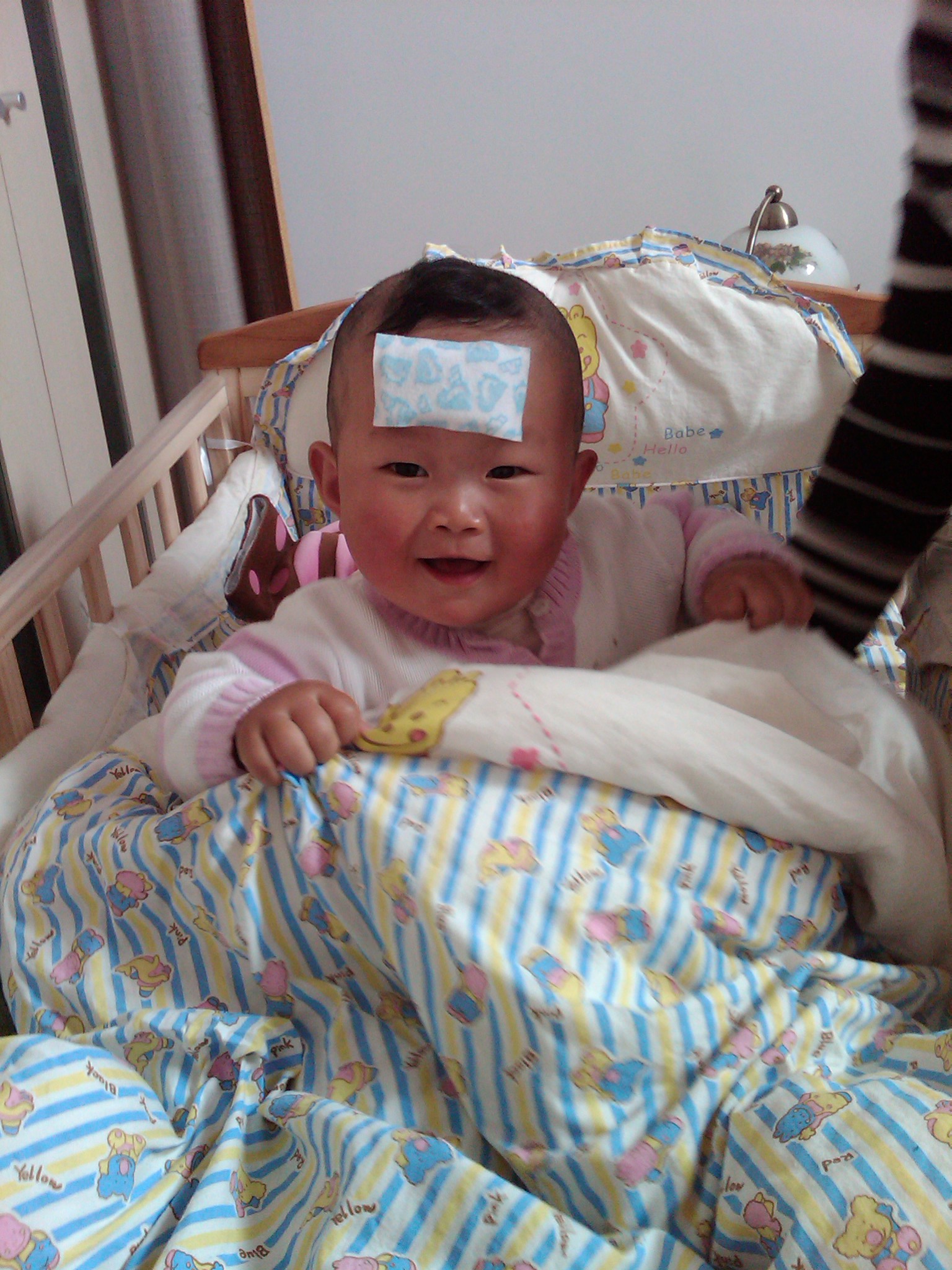 又给逍儿抱回11楼,护士给扎针,做皮试,问有什么过敏史,我说头孢,她说什么品种,我说不知道,反正有种是过敏的,又问吃什么过敏,我说一吃香蕉就起疙瘩。给逍儿做完皮试,又抱去给埋针。那个刮胡刀都不快,给逍儿剃头发的时候,都刮不下来,给逍儿扎针的时候逍儿拉便便了,婆婆用手按着逍儿腿时候,都拉在婆婆手上了,逍儿扎完针就去病房等着了。四人间,已经有三个做完灌肠的了。逍儿现在精神好了很多,疼痛过去之后,又高兴起来了,护士来给吊上水,好久都不睡,我们就看着,都差不多十一点多钟才睡着。