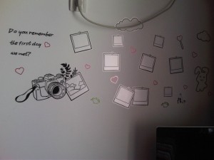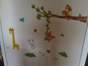 溜达一圈回来都九点半了,一开始胖子说明天再帖,我说那我就把贴玻璃上的先贴上,是麦兜的图案。胖子看我贴得好玩,就说,开始贴吧,于是就一发不可收拾了。贴法很简单,把墙面用干抹布擦一下灰就可以了,贴纸一开始从上面不好撕,等最后都快贴完了,才发现,用水果刀尖稍微一挑就开了。