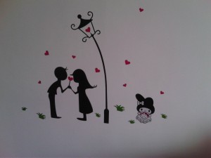 主卧进门墙面的浪漫情人,如果图案粗一点是不是就是我和胖子了,边上的小娃娃如果是男孩,就是逍了,哈哈!