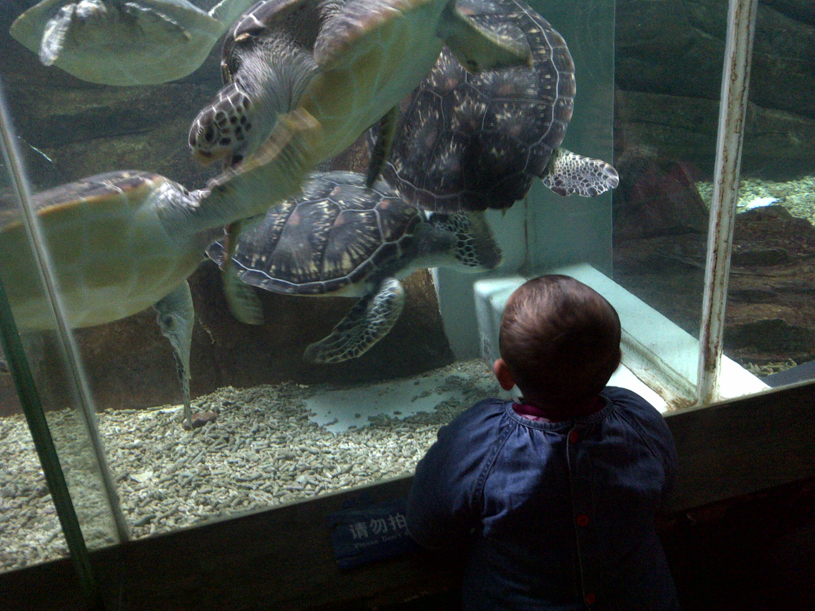 好久没带逍儿去海洋公园玩了,上次去的时候还是十一呢,已经有两个月没去了。感觉这次去,逍儿明显懂了不少,看动物的时候也更认真了。教他说什么就是什么,比如和鹦鹉说,你好,就跟着鹦鹉走来走去说你好。看见游来游去的好多鱼,我说了一句哇,好多鱼啊!逍就学会了,每次看到鱼就说,哇,好多鱼啊!看海豚表演的时候也是,海豚还在水里游呢,他就在哪里好高兴的说,哇!