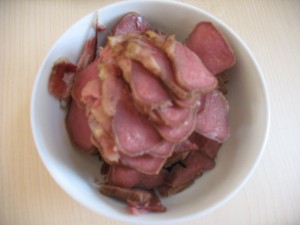 家里的香肠已经晒好了,这几天合肥温度很高,香肠都冒油了,同事说晒到这个程度可以了,再晒干了就不好吃了,昨天晚上把香肠都包起来放到冰箱冷冻室了,比较咸,现在不能多吃,等生孩子之后再吃。留了两截在外面,等馋了时候解解馋。