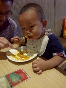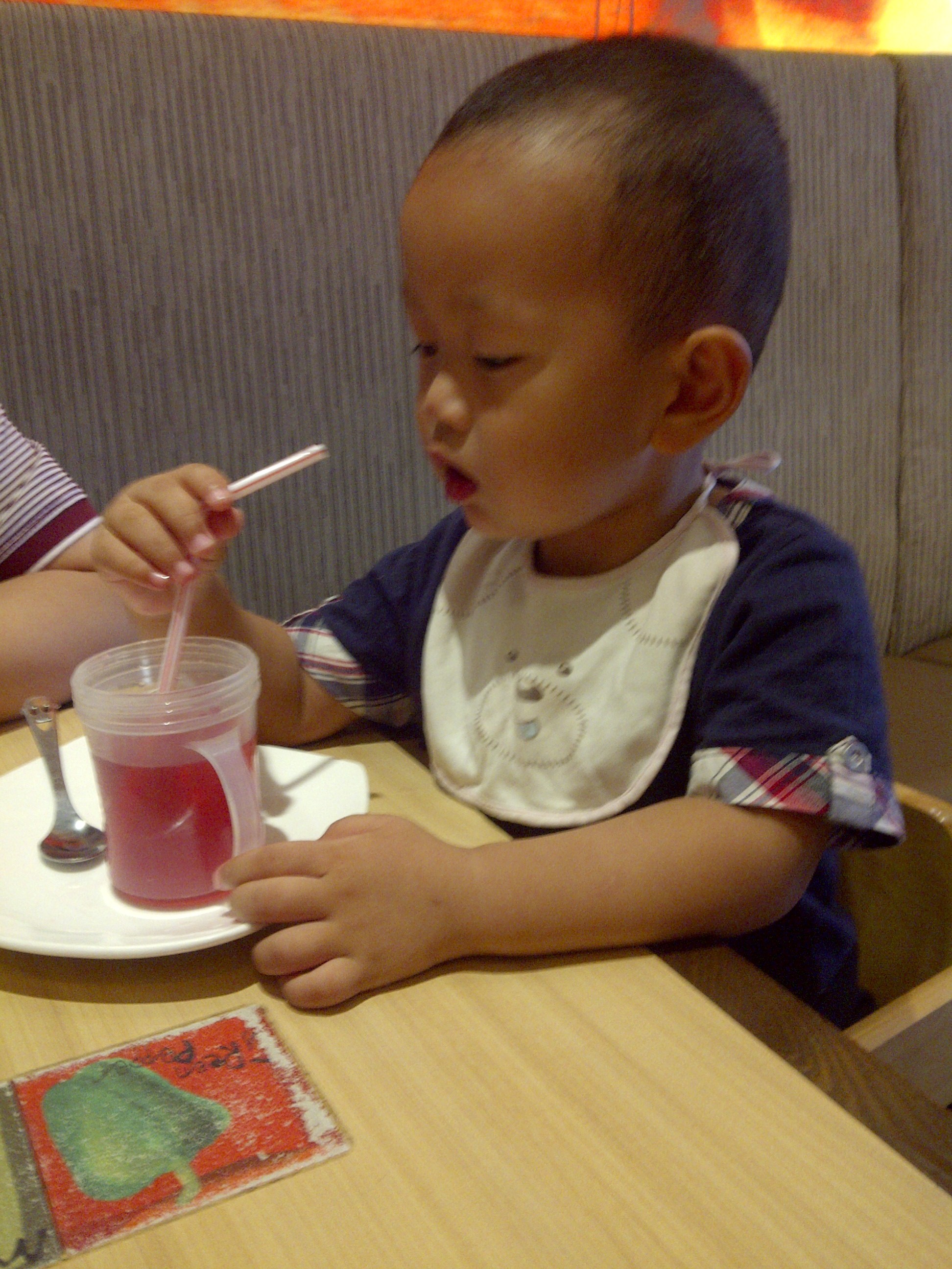 去市里,还是逛得百大,先逛了百货大楼,衣服都是大妈级的,出来之后,看时间11点多了,就先去吃饭吧,好久没吃必胜客了,到了门口,看等的人也不多,我们第三个,点了个二人套餐,周末半价餐,红酒一杯,牛排一份,还有一份培根炒饭。逍儿用叉子吃面条一身劲,上来的冷饮太凉,不敢直接给他喝,兑了点水。总之吃的很饱,只是这几份冷饮都不好喝。最后上来的冰淇淋球,逍儿嚷着要吃冰淇淋,喂他吃了几小口。